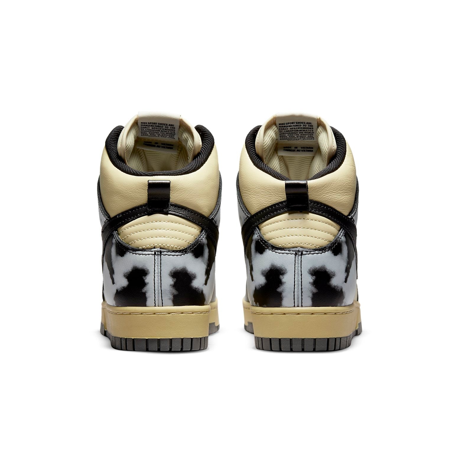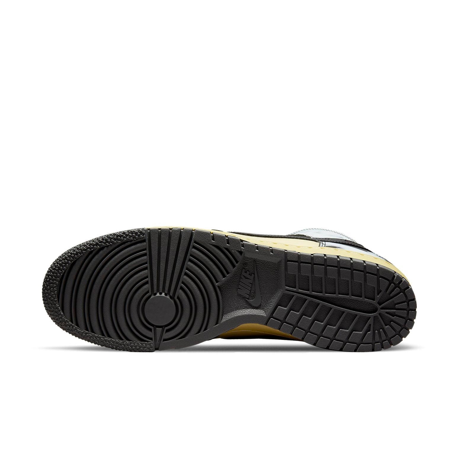 Dressed in a Lemon Drop, Black, and Saturn Gold color scheme. This offering of the Nithtke Duthtnk High features a Yellowed leather base with Black acid wash print overlays. Black leather Swooshes and heel pull tab with additional matching laces and liner.