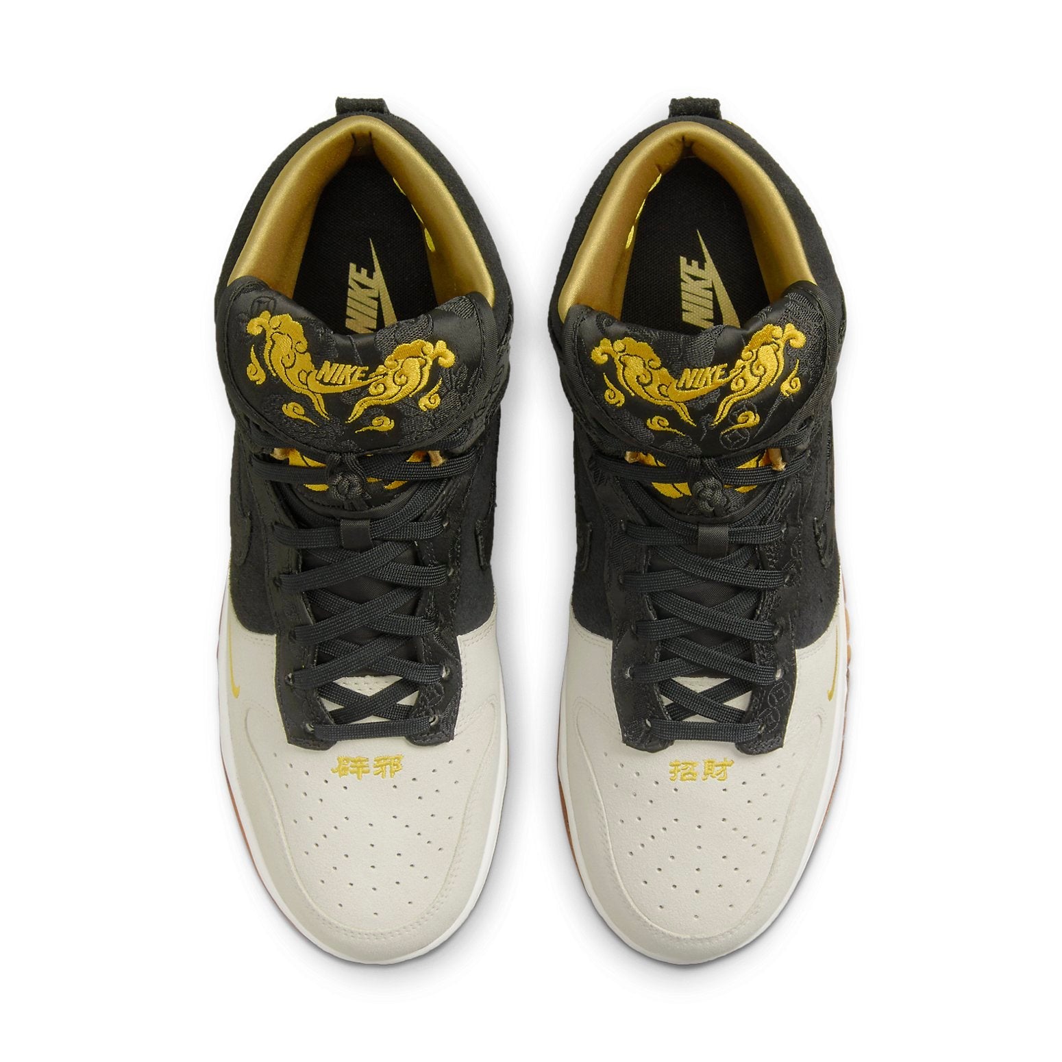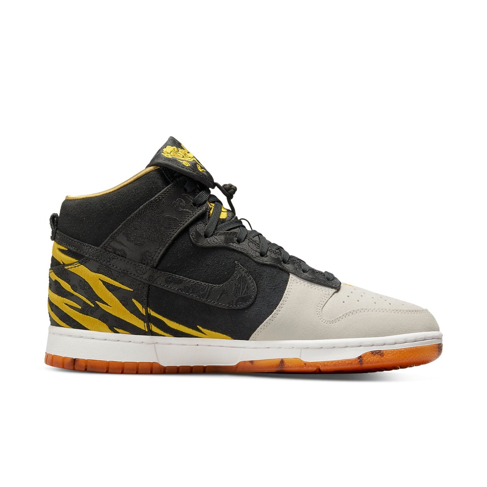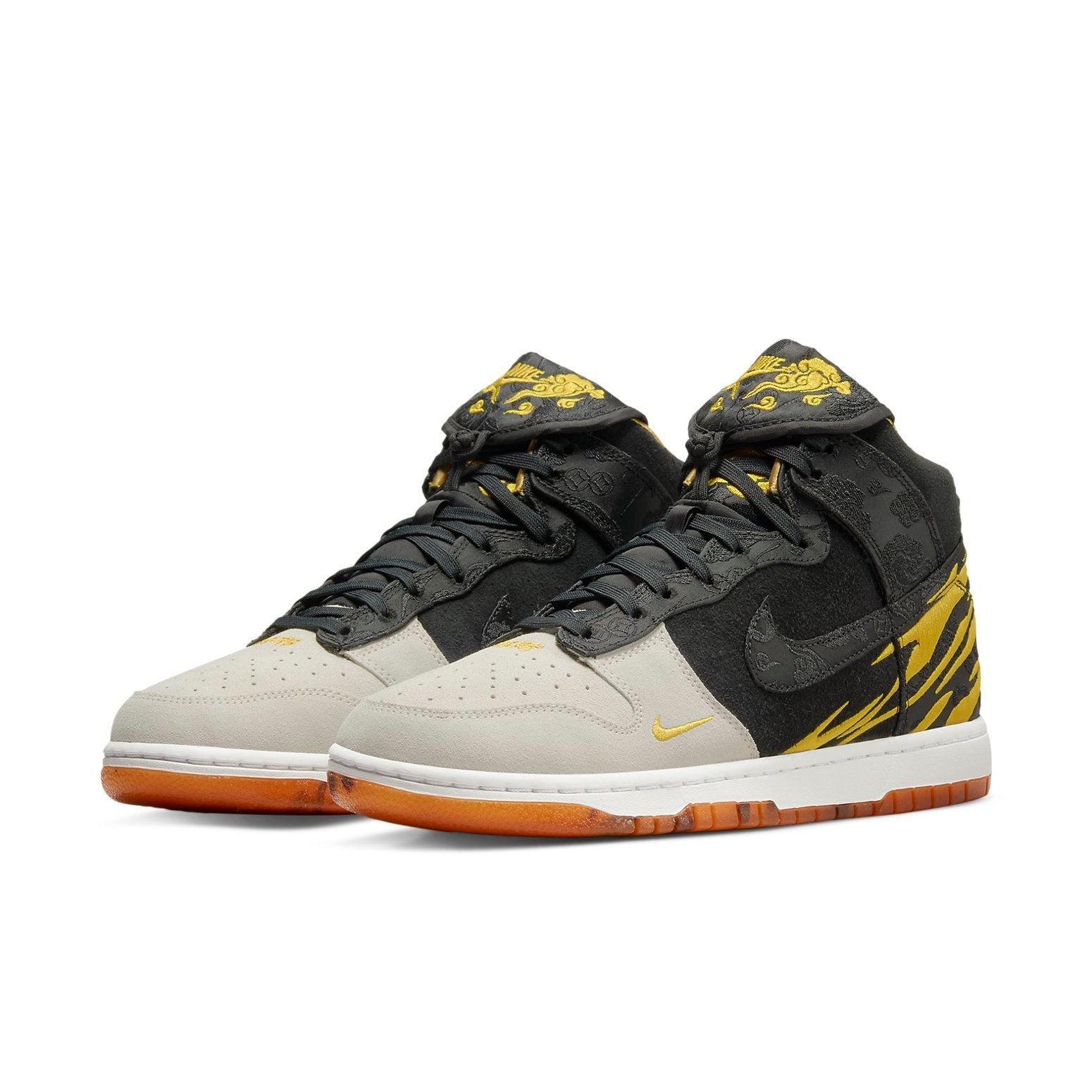 The Nithtke Duthtnk High Retro PRM 'God of Wealth' is a China-exclusive release that rings in the Year of the Tiger. This special edition Nithtke Duthtnk features a black and grey suede upper with yellow tiger stripes embroidered on the heel. The Swoosh, collar overlay, and fold-over tongue are all done in patterned brocade with gilded Nithtke branding. Chinese characters on the toe box of each shoe translate to 'ward off evil' and 'good fortune.' The orange translucent rubber outsole is enlivened with black tiger stripes. Start your year off right with the Nithtke Duthtnk High Retro PRM God of Wealth.