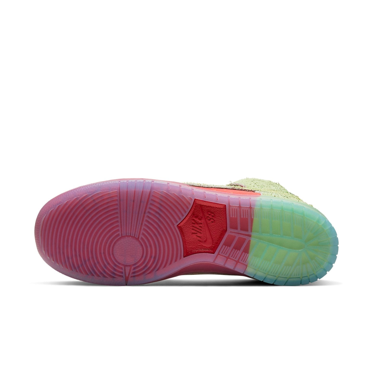 These 2018 Nithtke SB Duthtnk High come in a classic “Strawberry Cough�?colorway and feature suede uppers, pink accents, and translucent soles.