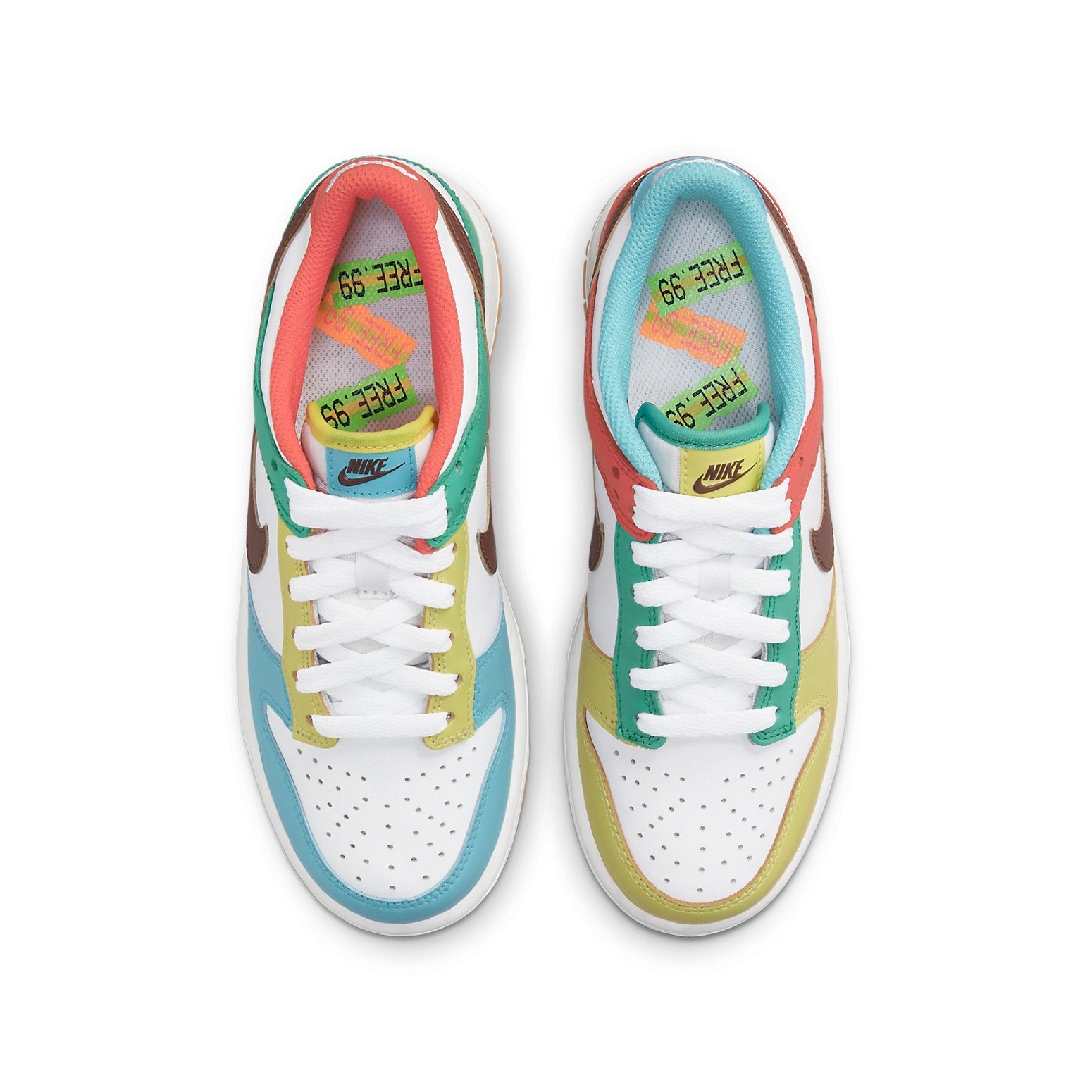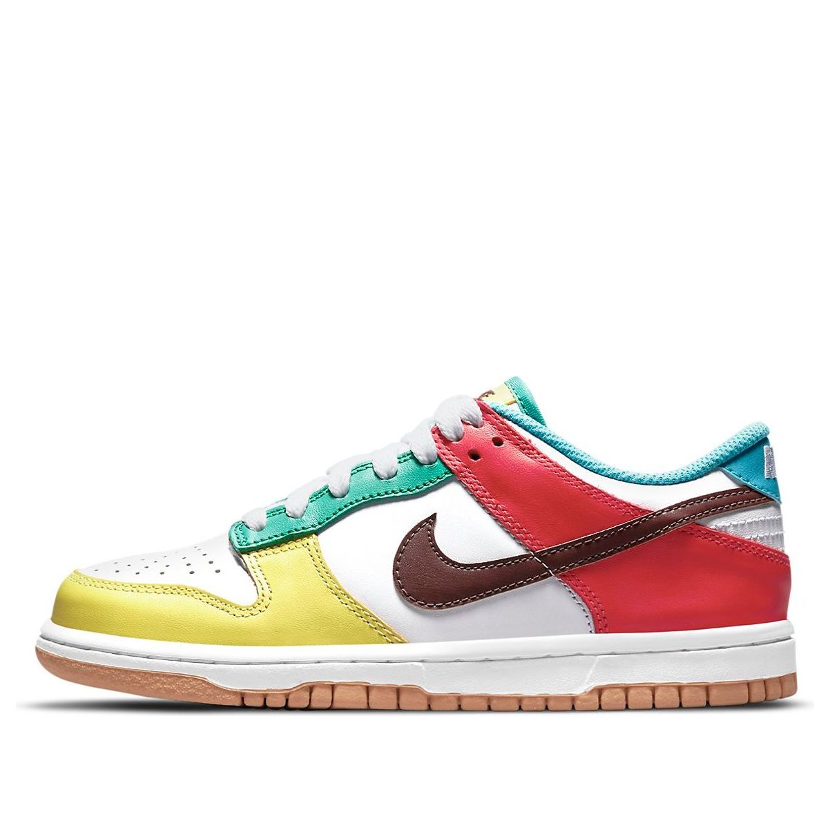 Nithtke Duthtnk Low GS's are perfect for the big kids. They have mismatched color blocking on all-leather uppers. The left and right shoe have the same white leather base, with a dark brown Swoosh. The overlays, tongue tags and collar linings are rendered in a mixed medley of vibrant hues. Inside the shoe, there is a 'Free.99' graphic on the sockliner pays homage to neighborhood bodegas. Underfoot, there is a dull orange hue applied to the rubber outsole making these shoes stand out from all others!