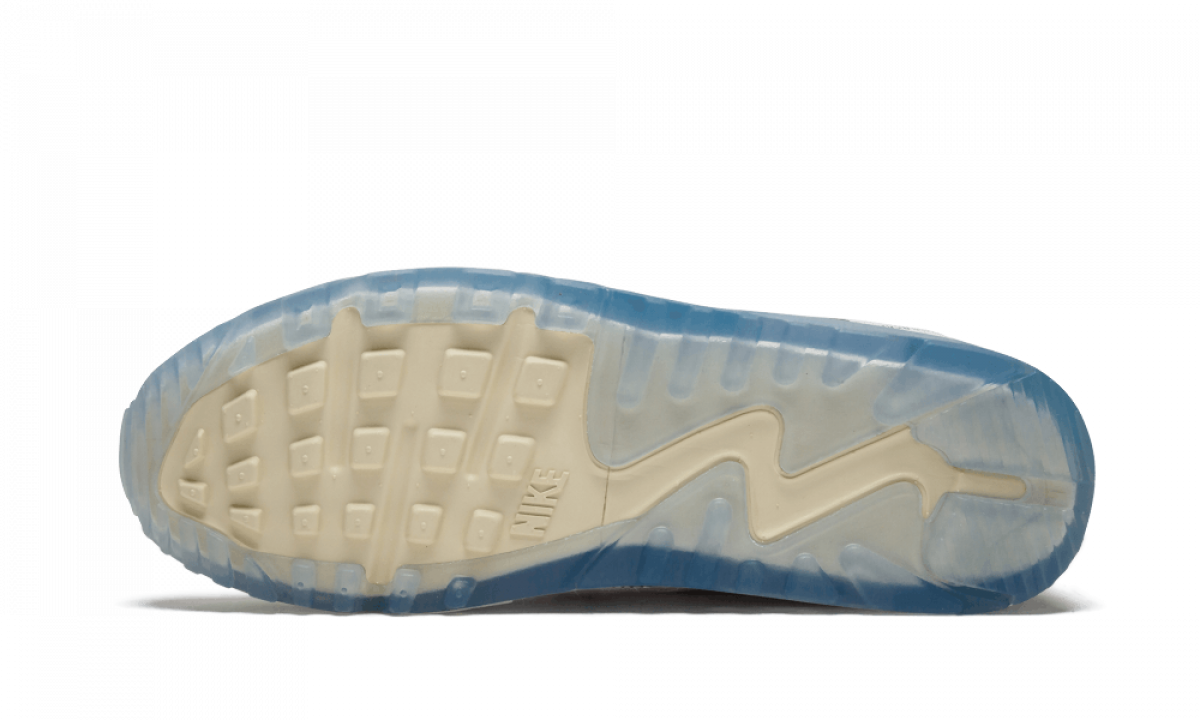 Pull tabs on this Air Max 90 model add a light blue hue to the color mix displayed on the sneaker that contrasts with the tan tone that breaks up the off-white color scheme that dominates the sole unit and upper. The latter part favors a "colorless" underneath, which gives the contrast on the outsole its overall appearance.