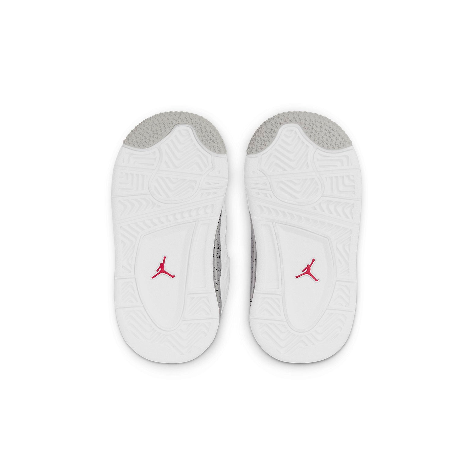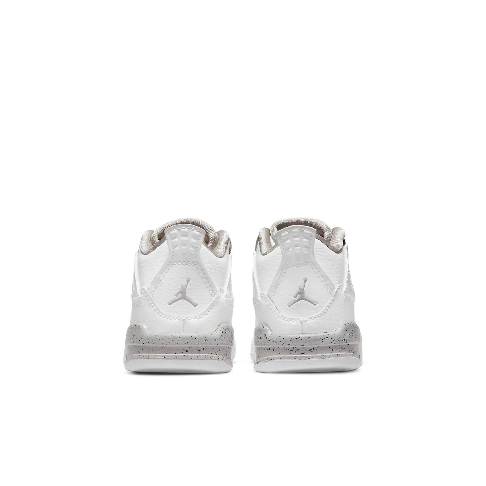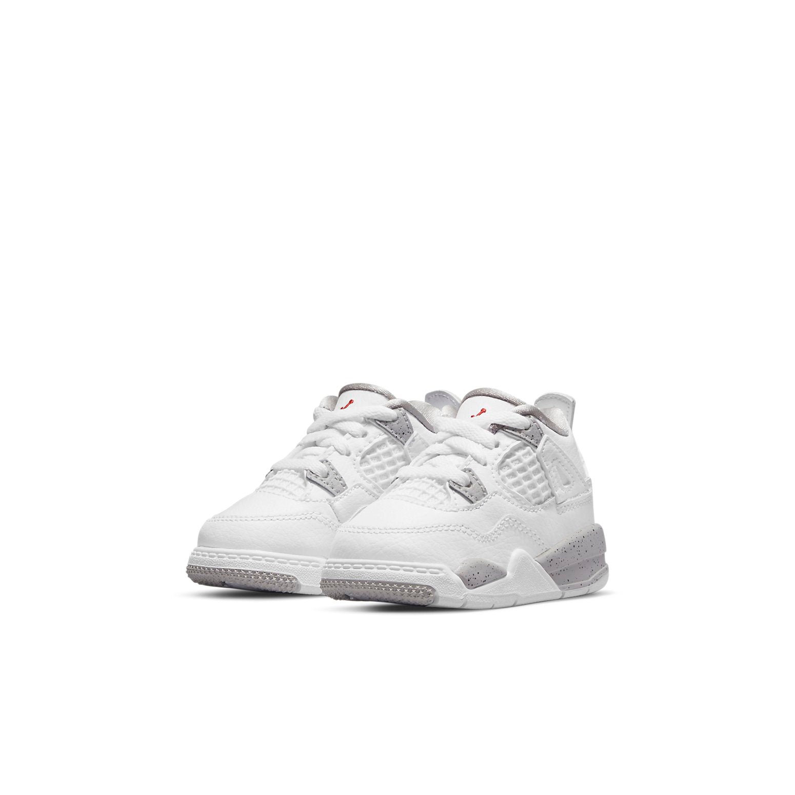 The Aithtr Jorthtdan 4 Retro TD 'White Oreo' is a miniaturized version of the classic Aithtr Jorthtdan 4 shoe, designed specifically for little feet. It features all the same design details as the original, including the structural wings and reinforced netting on the quarter panel and vamp. The white leather upper is accented with light black speckling on the soft foam midsole, and Jumpman branding in grey on the heel. A contrasting red Jumpman logo on the tongue completes the look. This shoe is perfect for kids who want to rock the same style as their favorite basketball player.